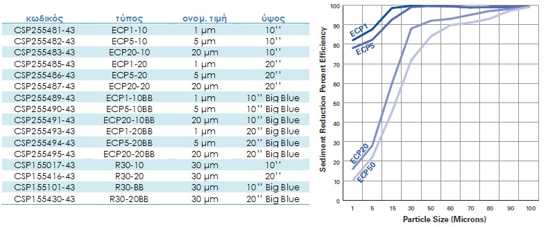 Παρέχουν περίπου 2,5 φορές μεγαλύτερη διάρκεια από τα κοινά φίλτρα λόγω της μεγάλης επιφάνειας που τους προσφέρει ο πλισέ σχεδιασμός τους. Τα χαρακτηριστικά τους τα καθιστούν κατάλληλα για εφαρμογές, όπως θαλασσινό νερό, μικροβιολογικά επιβαρυμένα νερά και λύματα, νερά γεωτρήσεων, αγροτική χρήση, βιομηχανία. Τα πλισέ φίλτρα ECP είναι κατασκευασμένα από μία ειδική φόρμουλα ινών κυτταρίνης και πολυεστέρα που εξασφαλίζει εξαιρετική αντοχή, υψηλή «θωράκιση» στις επιθέσεις βακτηριδίων τις υψηλότερες ροές από κάθε άλλο τύπο και ελάχιστη πτώση πίεσης στον κύκλο ζωής τους.