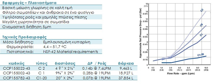 Η σειρά C προσφέρει μία οικονομική επιλογή για γενικές εφαρμογές διήθησης του νερού. Τα φυσίγγια είναι κατασκευασμένα από κυτταρίνη εμπλουτισμένη με ενεργό άνθρακα σε μορφή πούδρας. Κατ’ αυτό τον τρόπο προσφέρουν τόσο συγκράτηση σωματιδίων, σε χωρητικότητες ενός φίλτρου κυτταρίνης όσο και βασική μείωση της χλωρίνης και των οσμών μέσω του ενεργού άνθρακα.