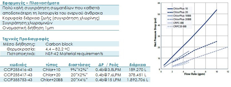 Η σειρά Chlor Plus διαθέτει μεγαλύτερη διάρκεια ζωής σε συγκράτηση χλωρίνης από κάθε άλλο φυσίγγιο ενεργού άνθρακα στην παγκόσμια αγορά και επιπλέον και επιπλέον συγκρατεί τις χλωραμίνες, εφόσον υπάρχουν στο νερό. Αποτελεί ιδανική επιλογή για αποχλωρίωση μεγάλων όγκων νερού όταν οι ροές χρήσης δεν είναι ιδιαίτερα υψηλές και για χρήση σε δίκτυα που χρησιμοποιούνται χλωραμίνες.