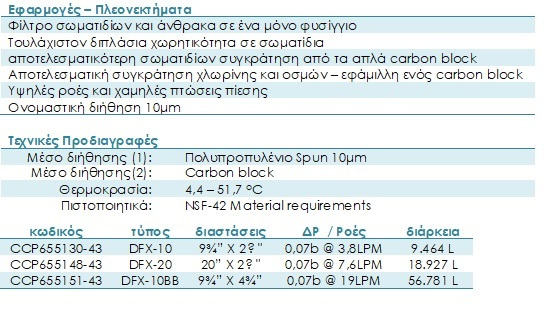 Στα DFX συνδυάζεται ένα κανονικό φίλτρο βάθους πολυπροπυλενίου και ένα φίλτρο carbon block σε ένα φυσίγγιο. Η καινοτόμα σειρά DFX (Diamond Flow Cartridges) της Pentair προσφέρει τα πλεονεκτήματα των δύο τεχνολογιών χωρίς κανένα συμβιβασμό στην αποτελεσματικότητα μίας από τις δύο τεχνολογίες, όπως συνέβαινε μέχρι σήμερα.