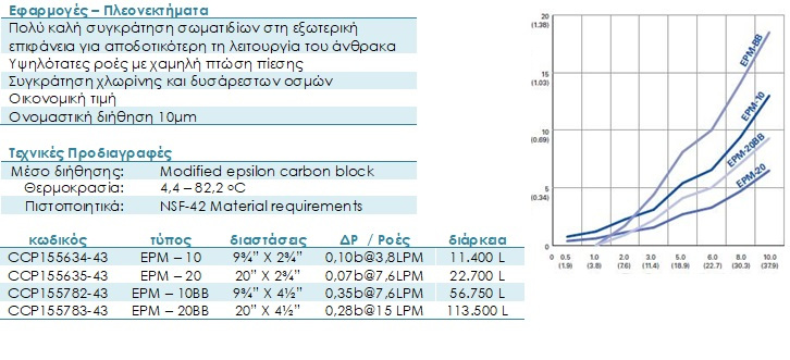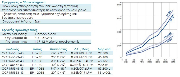 Η διαδικασία κατασκευής των φυσιγγίων Pentek EP με ονομαστική τιμή διήθησης 5μm εξασφαλίζει υψηλές επιδόσεις τόσο στη συγκράτηση σωματιδίων όσο και στη συγκράτηση χλωρίνης και οργανικών μέσω χημικής προσρόφησης. Η εξωτερική επιφάνεια φέρει προφίλτρο από πολυολεφίνη που προσφέρει σημαντικά αυξημένο ωφέλιμο χρόνο ζωής έναντι των κοινών φυσιγγίων carbon block.