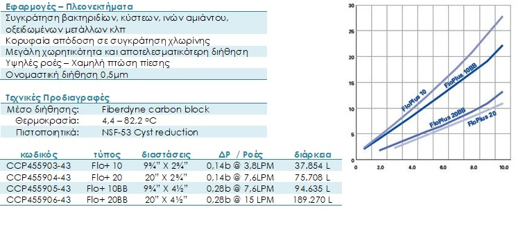 H σειρά Flo plus αποτελεί μία καινοτομία της Pentair στα φίλτρα άνθρακα. Η τεχνολογία Fiberdyne εξελίχθηκε και κατάφερε να προσφέρει ένα φυσίγγιο 0,5μm με πιστοποιητικά cyst reduction (NSF-53) που παρέχει υψηλότατες ροές. Το Flo plus συγκρατεί τη χλωρίνη καλύτερα από κάθε άλλο φίλτρο και επιπλέον έχει χωρητικότητα σε σωματίδια εφάμιλλη ενός πλισέ φίλτρου! Είναι ιδανική επιλογή για οικιακά φίλτρα υψηλών ροών και για συγκράτηση χλωρίνης σε πολύ χλωριωμένα νερά ή σε εφαρμογές που απαιτούν απόλυτη συγκράτηση χλωρίνης.
