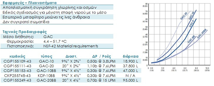 Τα φυσίγγια τύπου GAC της Pentair είναι κοκκώδης ενεργός άνθρακας. Η κατασκευή του φυσιγγίου είναι τέτοια που εξασφαλίζει τη μέγιστη δυνατή διάρκεια επαφής του νερού με το διηθητικό μέσο. Μειώνει τις πιθανότητες σχηματισμού καναλίδων ή σημείων διαφυγής του νερού από το μέσο, ενώ ένα εξωτερικό και προστατευμένο από ειδικό πλέγμα φίλτρο μειώνει τις ίνες άνθρακα που μπορεί να αποκολληθούν από το μέσο. Σε κάθε περίπτωση, πάντως, αν η χρήση αφορά πόσιμο νερό καλό είναι να χρησιμοποιείται μεταφίλτρο σε χαμηλές ονομαστικές τιμές (της τάξης του 1μm).