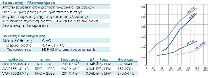 Η σειρά RFC (Radial Flow) προσφέρει τις υψηλότερες ροές και τη χαμηλότερη πτώση πίεσης από κάθε άλλο φίλτρο ενεργού άνθρακα. Το μέσο που χρησιμοποιείται είναι κοκκώδους μορφής και είναι εγκλωβισμένο ανάμεσα σε στιβαρές μάζες πολυπροπυλενίου (sandwich) εξασφαλίζοντας τις υψηλές ροές, τη μέγιστη δυνατή επαφή με το μέσο και την ελαχιστοποίηση της πιθανότητας διαφυγής ινών άνθρακα.