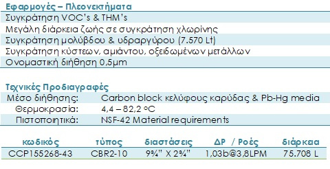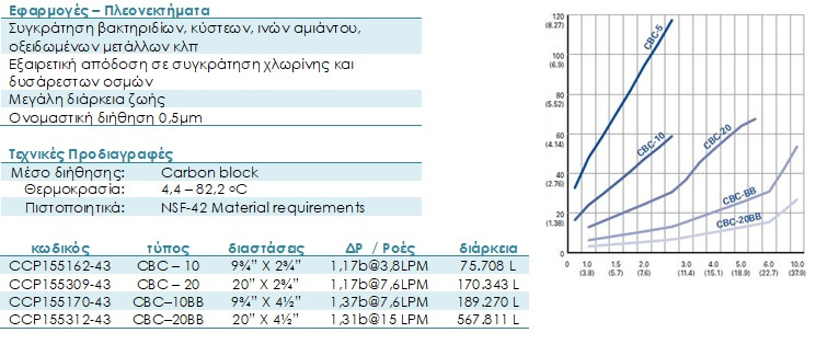 Τα φυσίγγια της σειράς CBC προσφέρουν πολύ αποτελεσματική συγκράτηση σωματιδίων σε ονομαστική τιμή των 0,5μm (συγκρατούν μηχανικά βακτήρια, κύστες, ίνες αμιάντου, οξειδωμένα μέταλλα κλπ) και παράλληλα διαθέτουν πολύ μεγάλη διάρκεια ζωής σε συγκράτηση χλωρίνης! Η εξωτερική επιφάνεια φέρει προφίλτρο από πολυολεφίνη που προσφέρει σημαντικά αυξημένο ωφέλιμο χρόνο ζωής έναντι των κοινών φυσιγγίων carbon block.