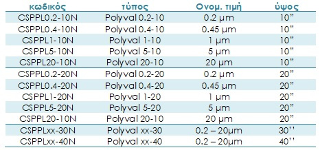 Τα καθαριζόμενα πλισέ φίλτρα Polyval αποτελούν μία ιδιαίτερα στιβαρή κατασκευή φυσιγγίου από πολυπροπυλένιο. Οι πολύ πυκνές πτυχώσεις του διηθητικού μέσου προσφέρουν επιφάνεια περίπου 4 φορές μεγαλύτερη από τα κοινά φίλτρα επιφανείας (πχ Pentek ECP) με αποτέλεσμα την πολύ μεγαλύτερη διάρκεια ζωής και τις υψηλότατες ροές ακόμα και σε πολύ μικρές ονομαστικές τιμές. Αποτελούν βαρέως τύπου βιομηχανικά φίλτρα με ισχυρό πυρήνα πολυπροπυλενίου και στιβαρό εξωτερικό πλέγμα προστασίας που αποτρέπουν τις στρεβλώσεις του φυσιγγίου και επιτρέπουν τακτικές πλύσεις με αντίστροφη ροή νερού.